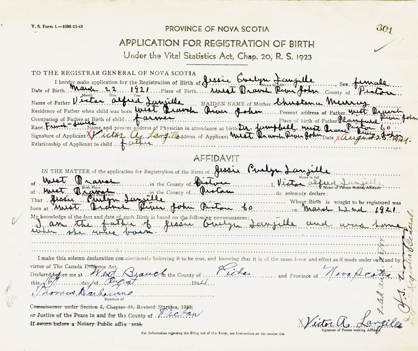 I hereby make application for the Registration of Birth of Jessie EvelynLangille Sex Female