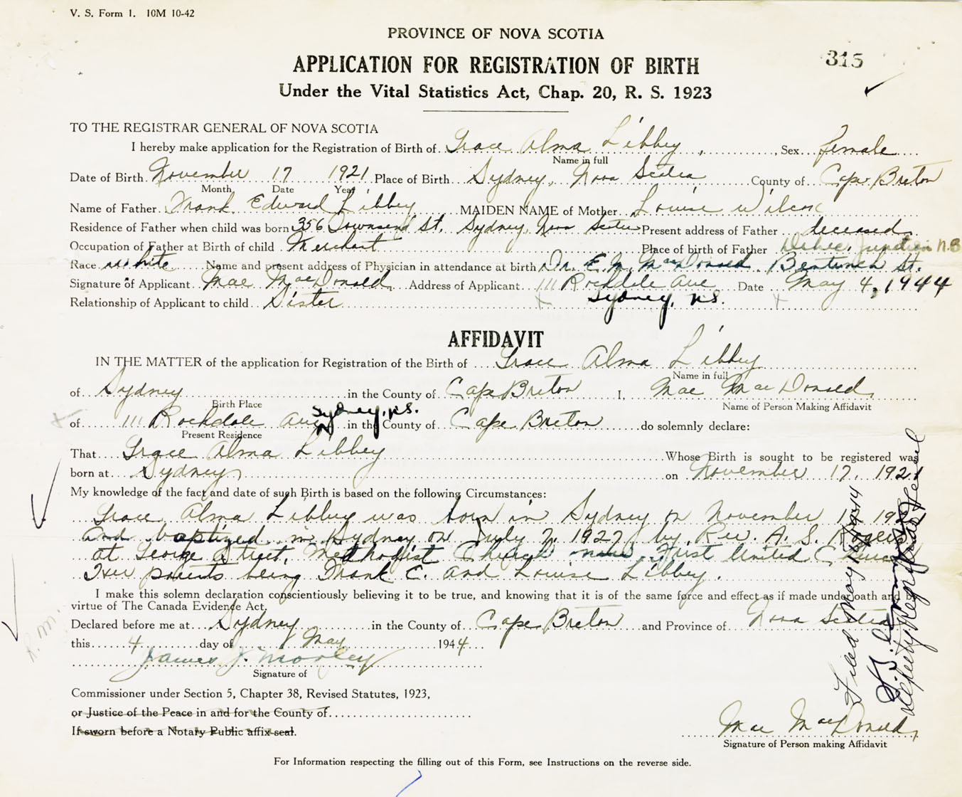 Grace Alma Libbey was born in Sydney on November 17, 1921 and baptized in Sydney on July 7, 1927 by Rev. A. S. Rogers at George Street Methodist Church, now First United Church, her parents being Frank E. and Louise Libbey.