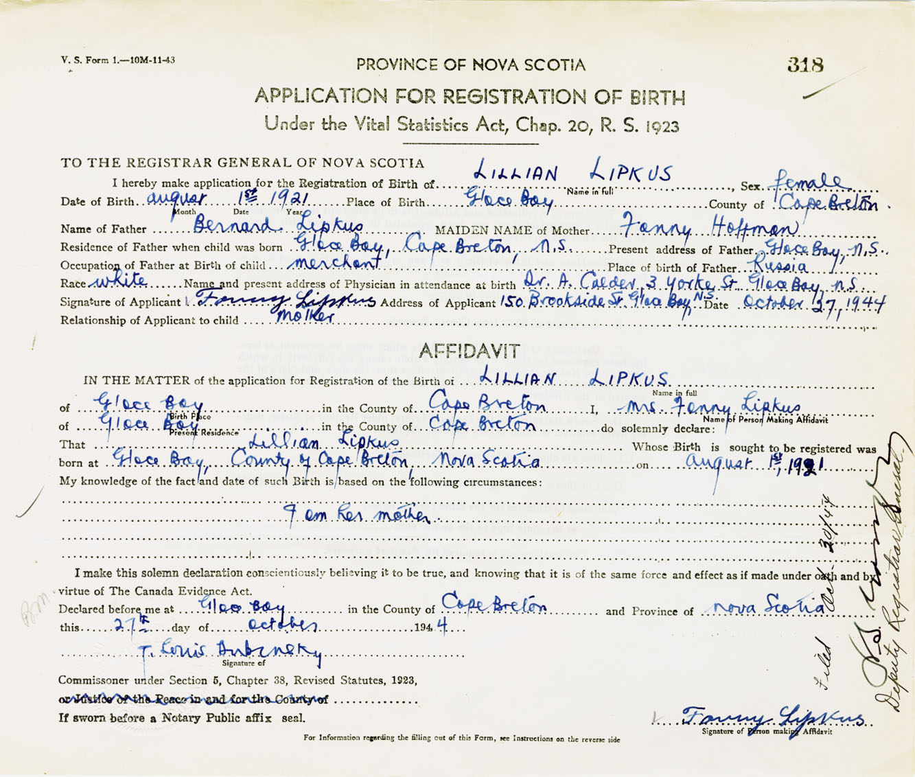 Signature of Applicant Fanny Lipkus Address of Applicant 150 Brookside Street, Glace Bay, Cape Breton Co., NS Date 27 October 1944