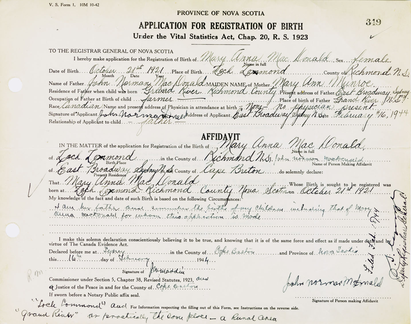 I am her father and remember the births of my children including that of Mary Anna MacDonald for whom this application is made.