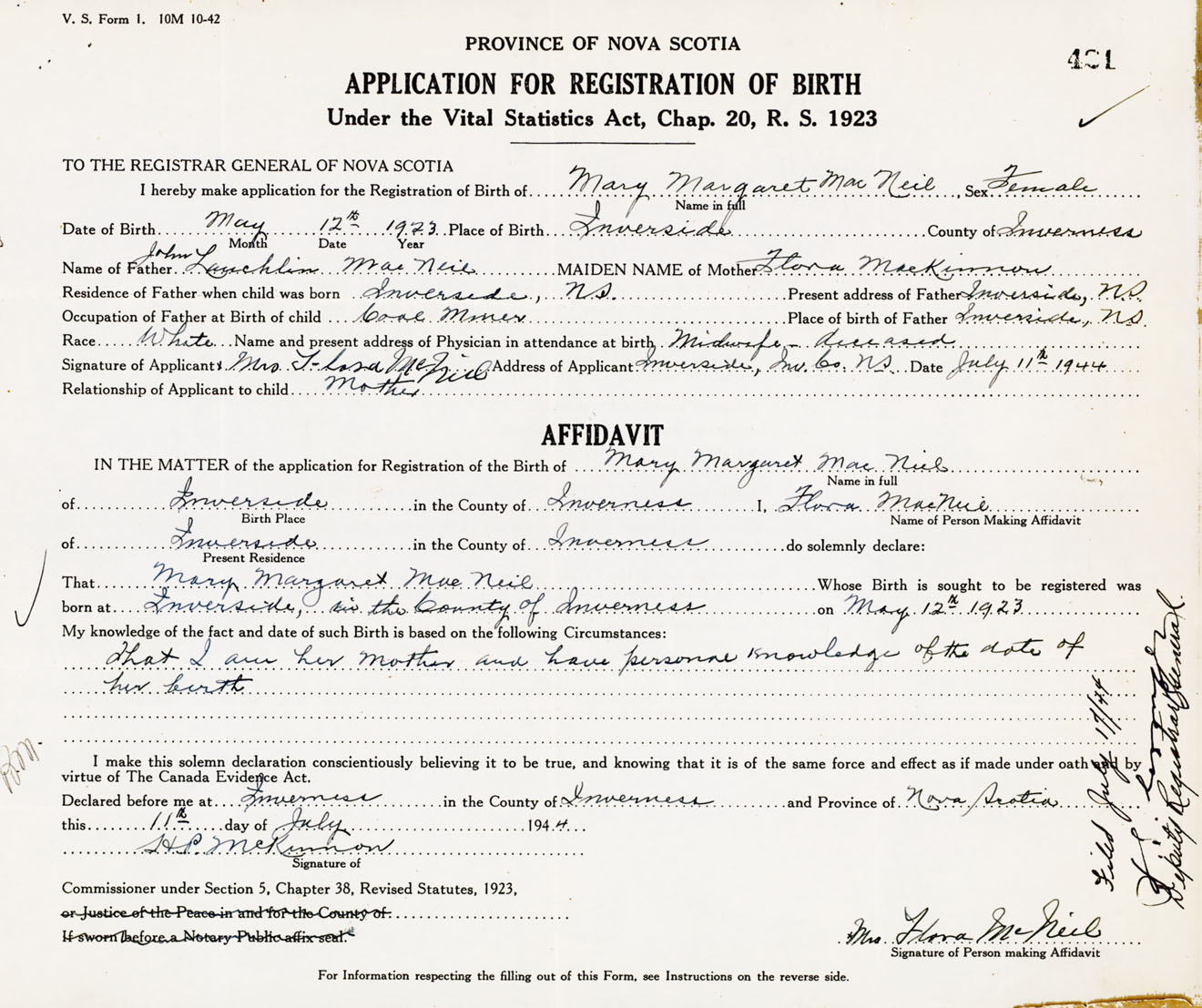 Signature of Applicant Mrs. Flora MacNeil Address of Applicant Inverside, Inverness Co., NS Date 11 July 1944