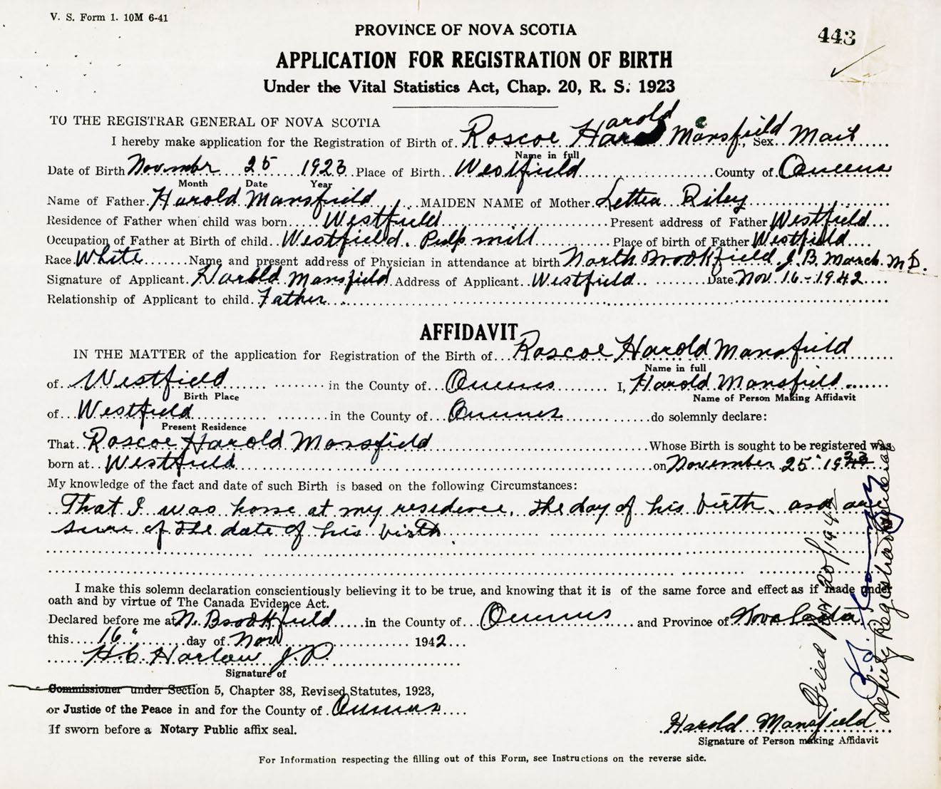 Signature of Applicant Harold Mansfield Address of Applicant Westfield, Queens Co., NS Date 16 November 1942
