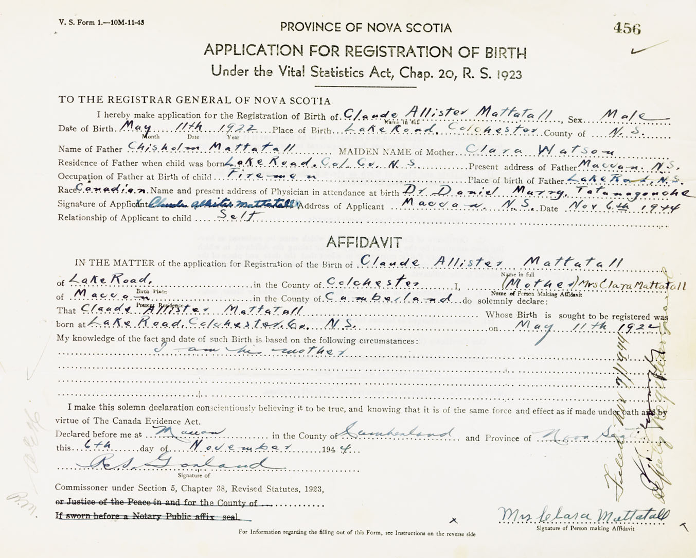 Signature of Applicant Claude Allister Mattatall Address of Applicant Maccan, Cumberland Co., NS Date 6 November 1944