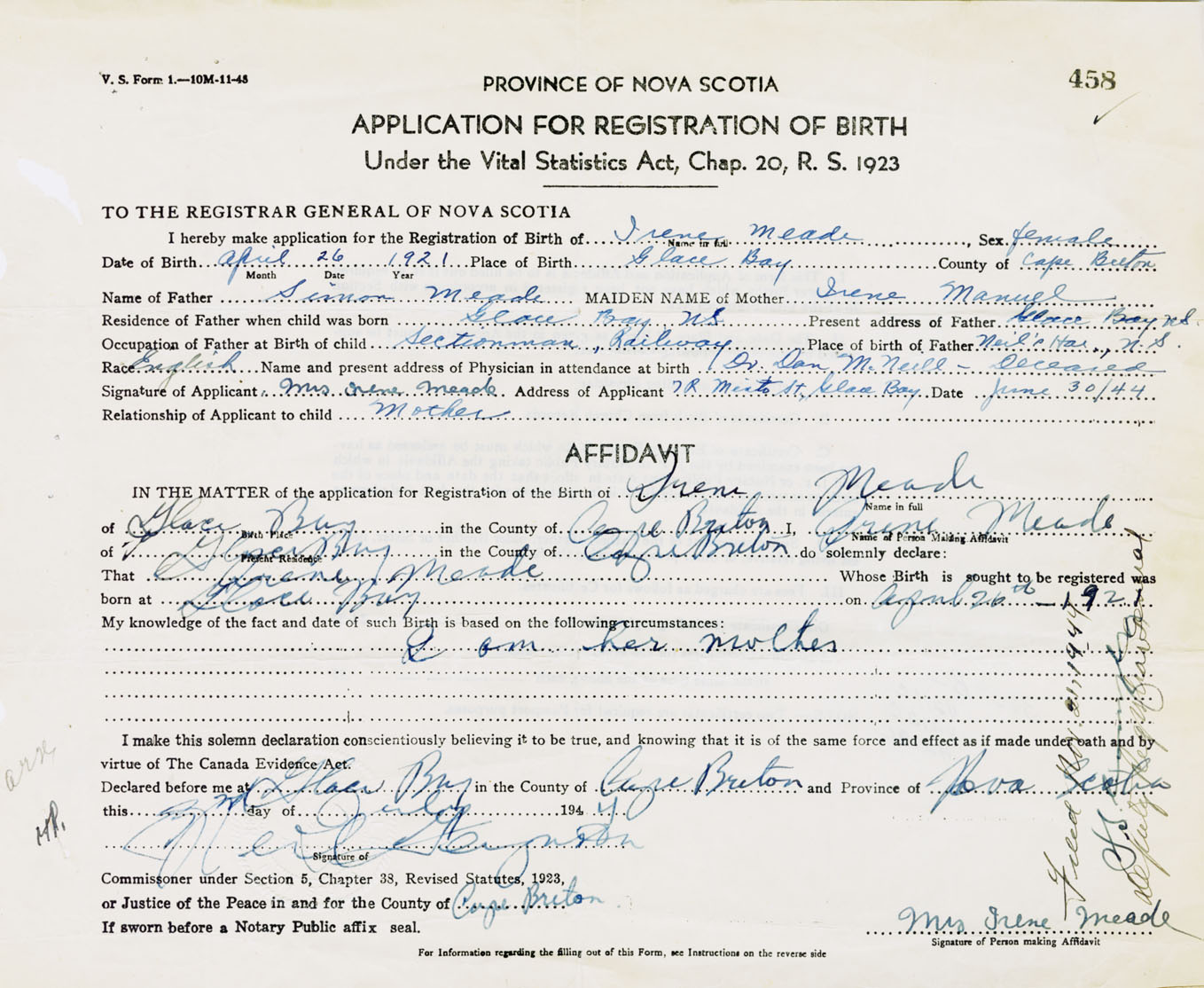 Signature of Applicant Mrs. Irene Meade Address of Applicant 7R Minto Street, Glace Bay, Cape Breton Co., NS Date 30 June 1944