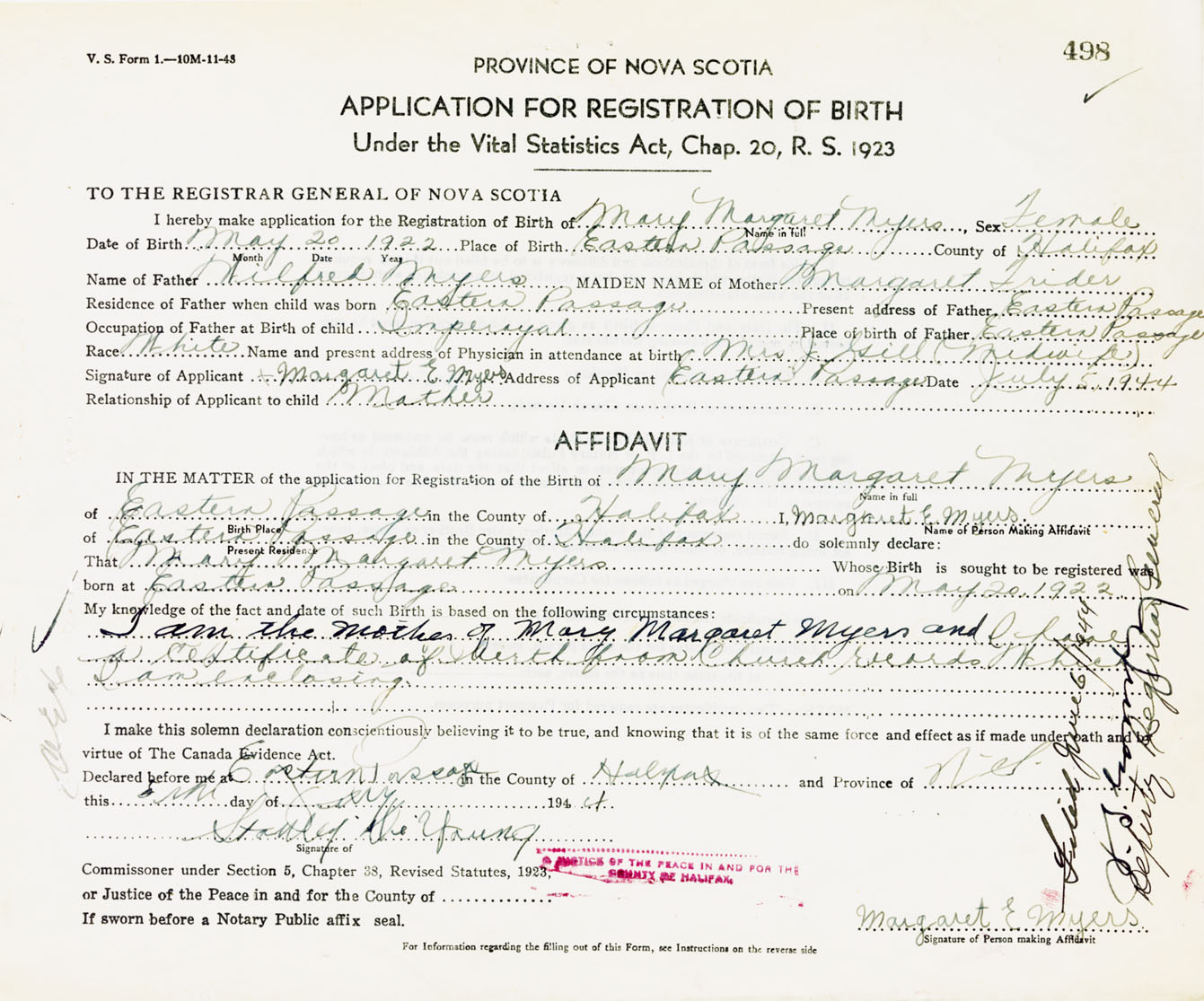 Signature of Applicant Margaret E. Myers Address of Applicant Eastern Passage, Halifax Co., NS Date 5 July 1944