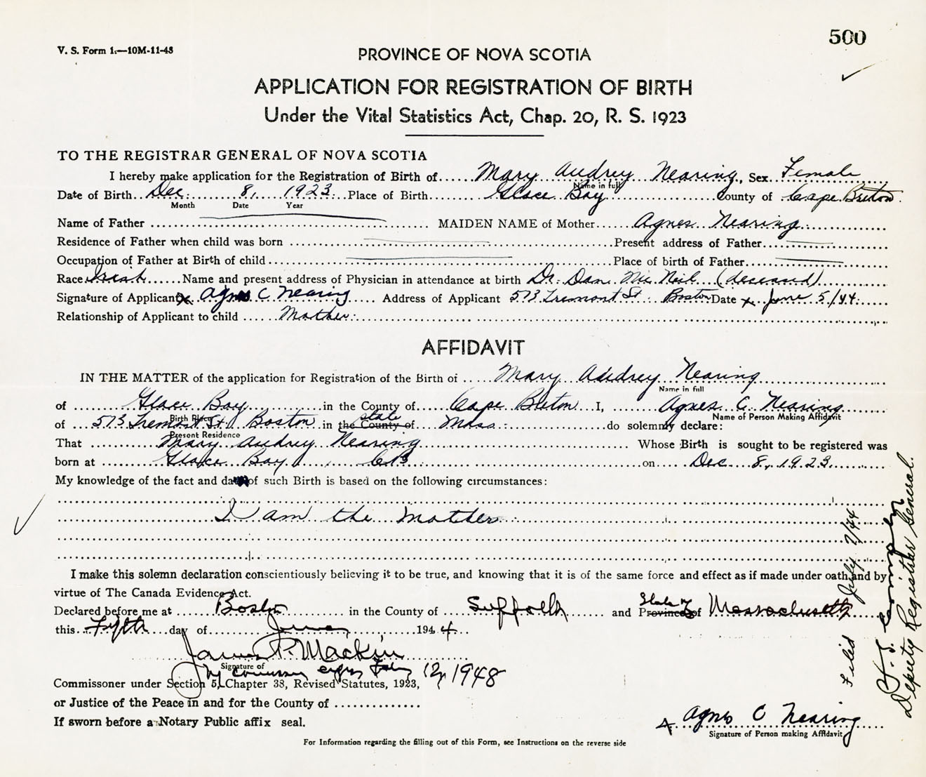 Signature of Applicant Agnes C. Nearing Address of Applicant 513 Tremont Street, Boston, Massachusetts, USA Date 5 June 1944