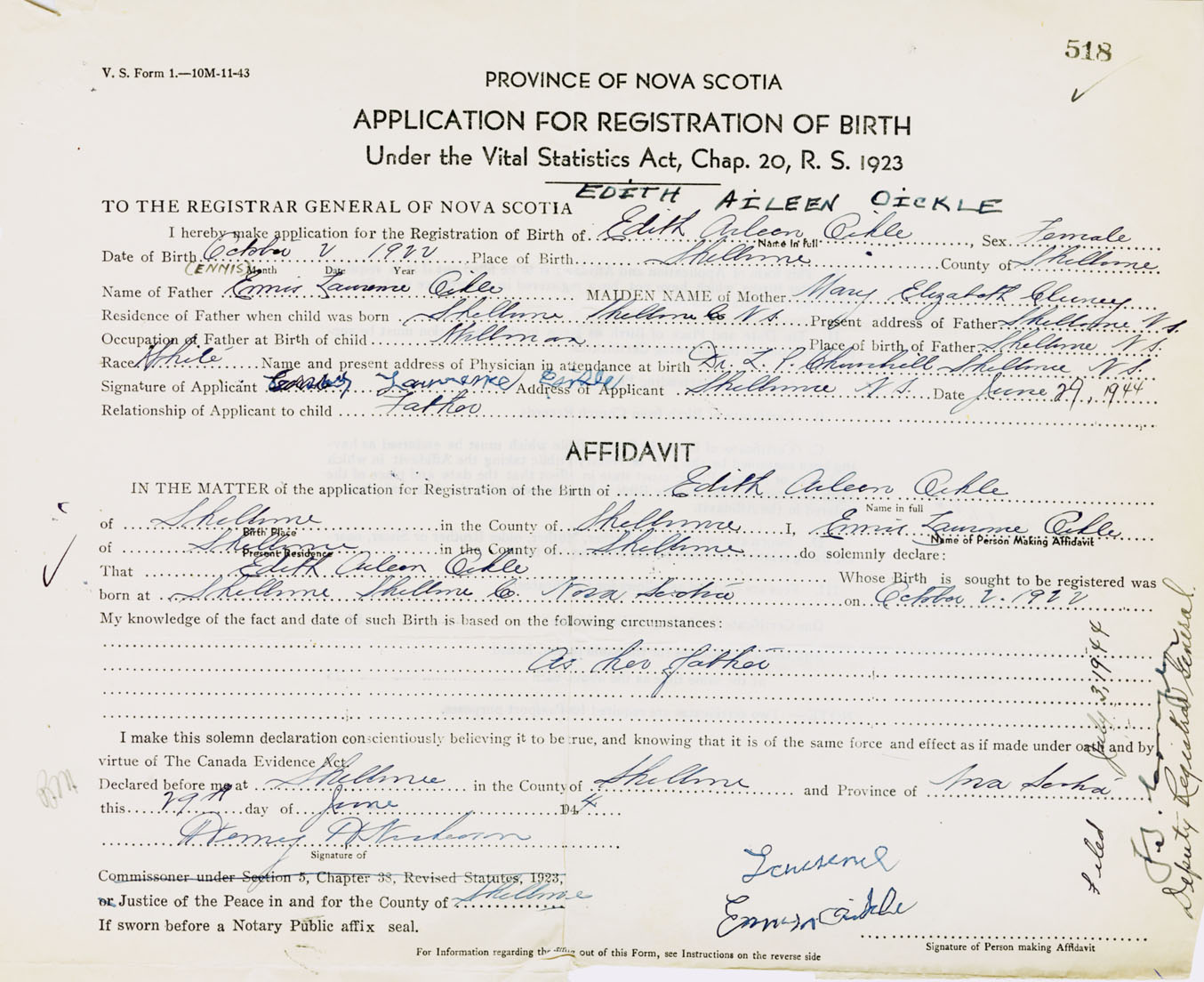I hereby make application for the Registration of Birth of Edith AileenOickle Sex Female