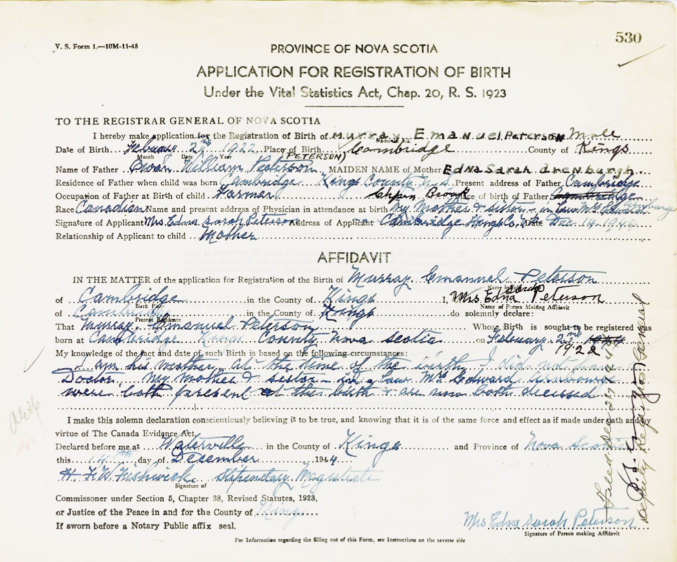 Signature of Applicant Mrs. Edna Sarah Peterson Address of Applicant Cambridge, Kings Co., NS Date 14 December 1944