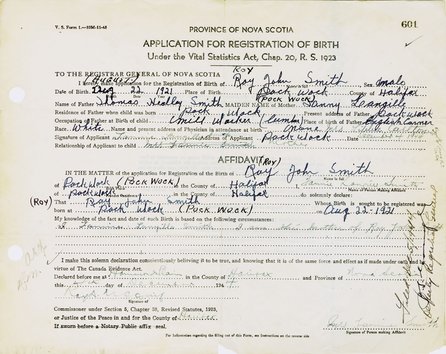 Signature of Applicant Fannie Langille Smith Address of Applicant Pockwock, Halifax Co., NS Date 4 December 1944