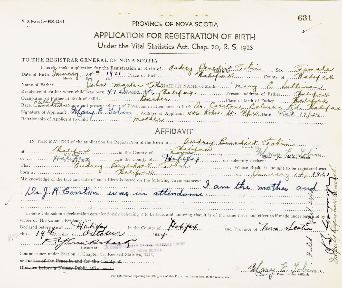 I hereby make application for the Registration of Birth of Audrey BenedictTobin Sex Female