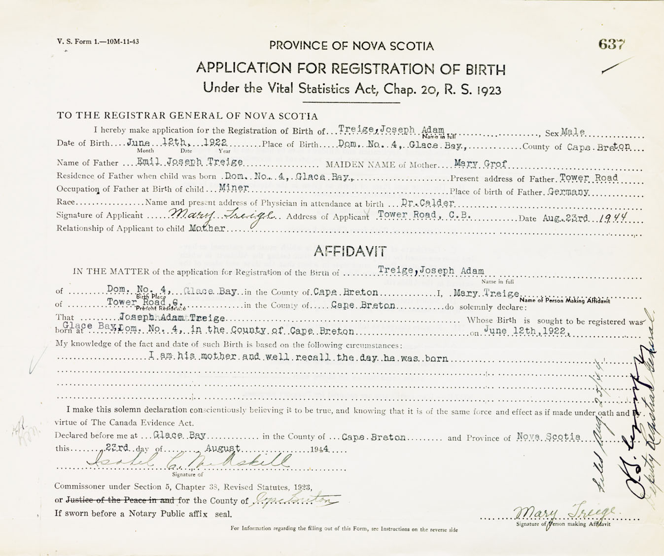Signature of Applicant Mary Triege Address of Applicant Tower Road, Cape Breton Co., NS Date 23 August 1944