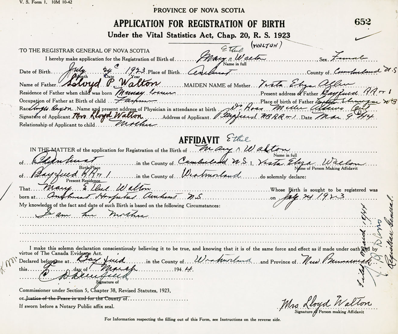 Signature of Applicant Mrs. Lloyd Walton Address of Applicant RR #1, Bayfield, Westmorland Co., New Brunswick Date 9 March 1944