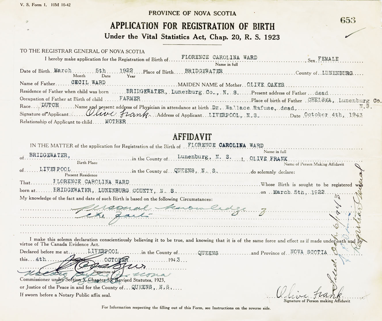 Signature of Applicant Olive Frank Address of Applicant Liverpool, Queens Co., NS Date 4 October 1943