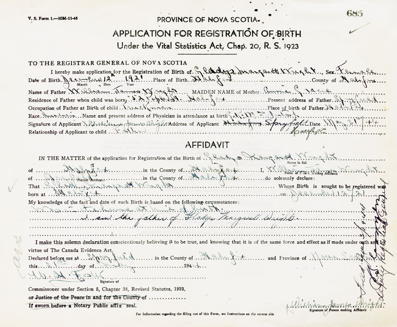Signature of Applicant William James Wright Address of Applicant Spryfield, Halifax, NS Date 31 May 1944
