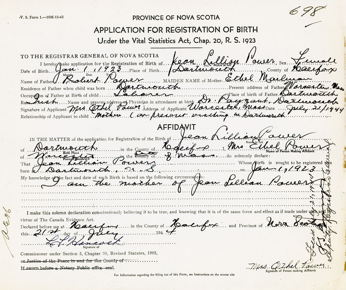 I hereby make application for the Registration of Birth of Jean LillianPower Sex Female