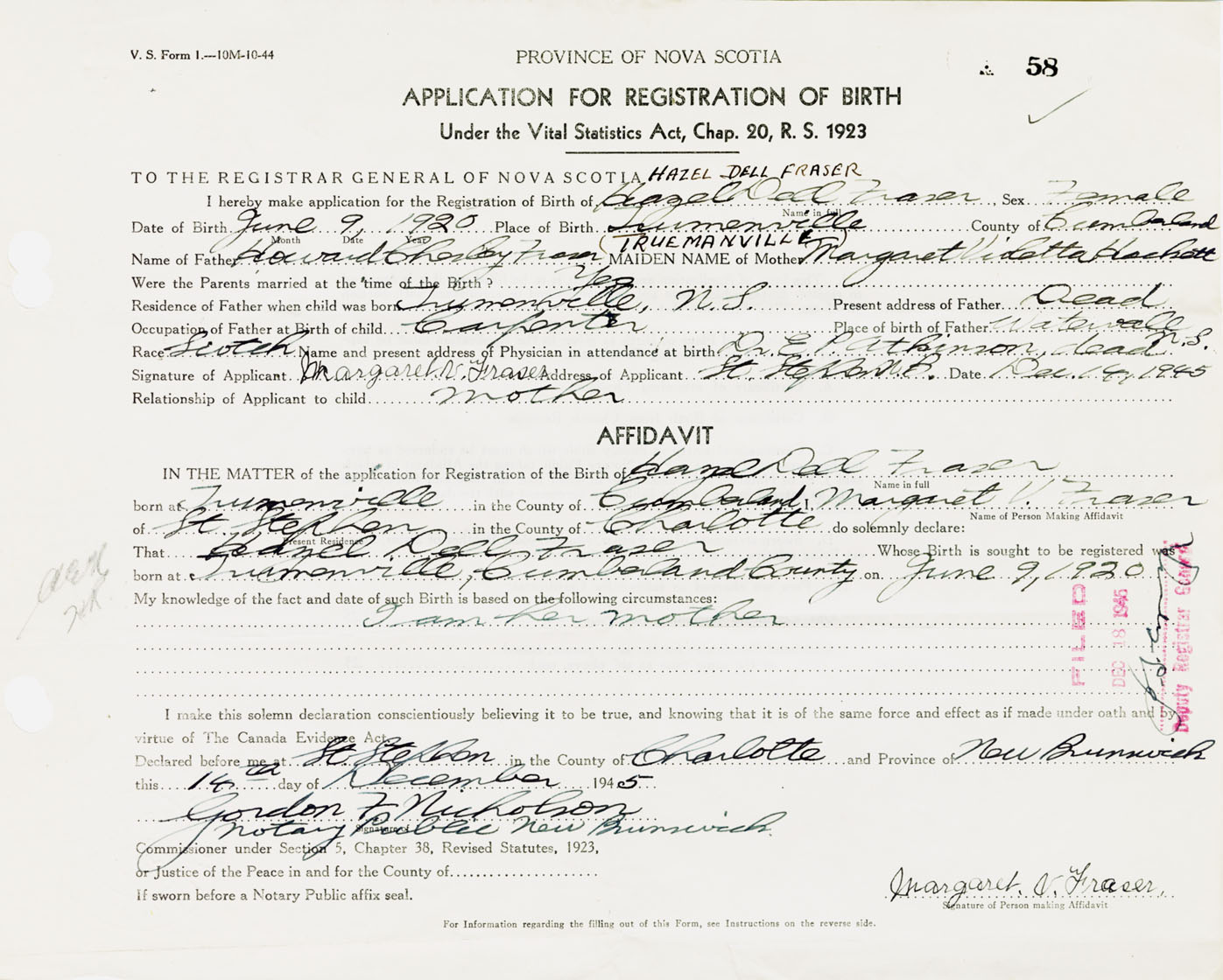 I hereby make application for the Registration of Birth of Hazel DellFraser Sex Female