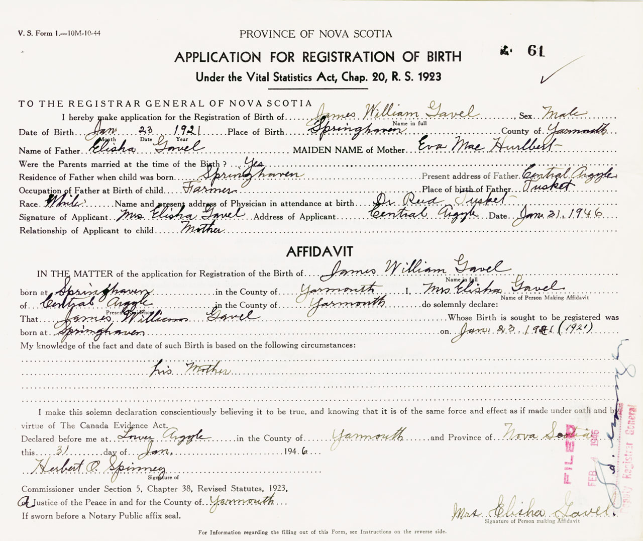 Signature of Applicant Mrs. Elisha Gavel Address of Applicant Central Argyle, Yarmouth Co., NS Date 31 January 1946