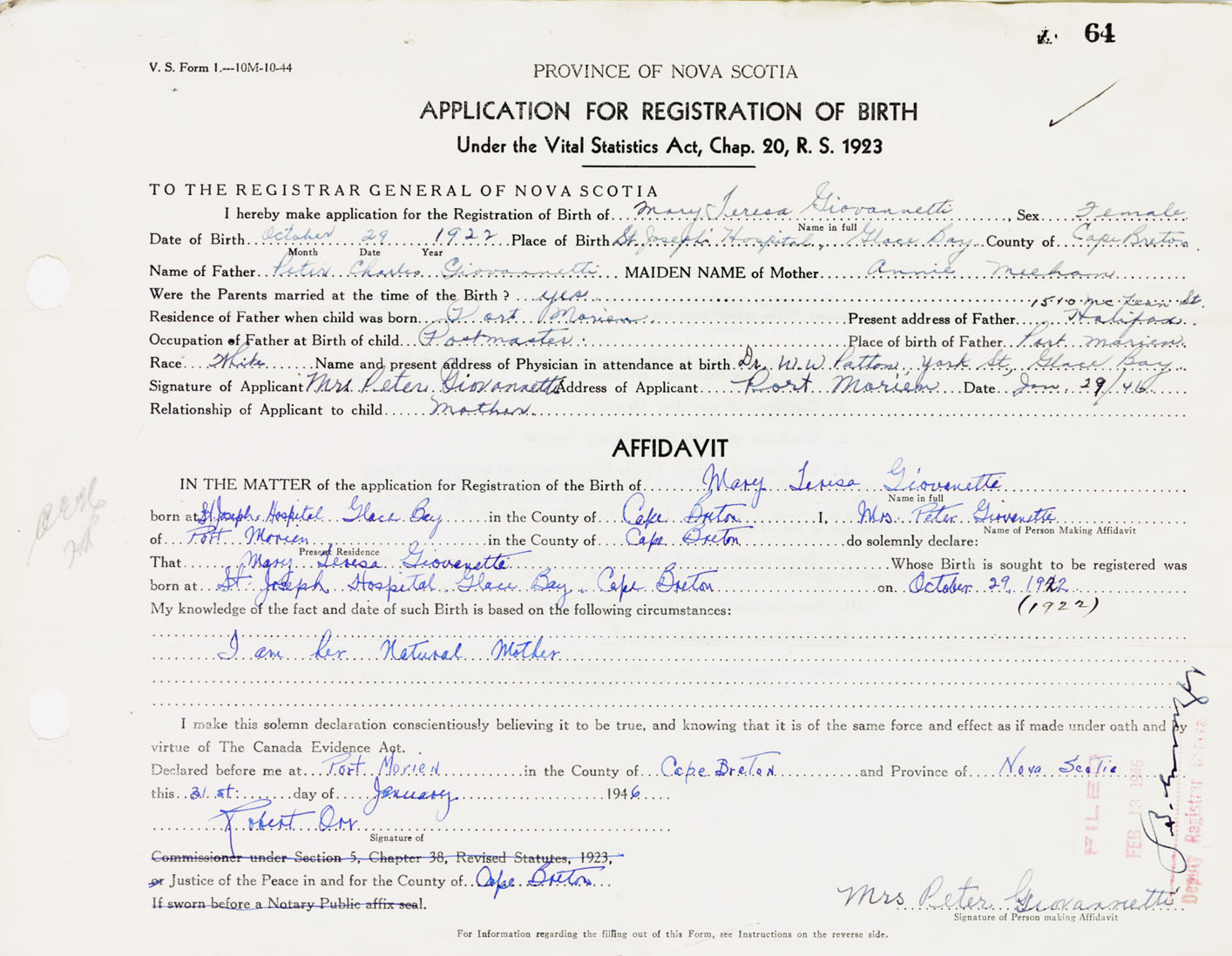 Signature of Applicant Mrs. Peter Giovannetti Address of Applicant Port Morien, Cape Breton Co., NS Date 29 January 1946