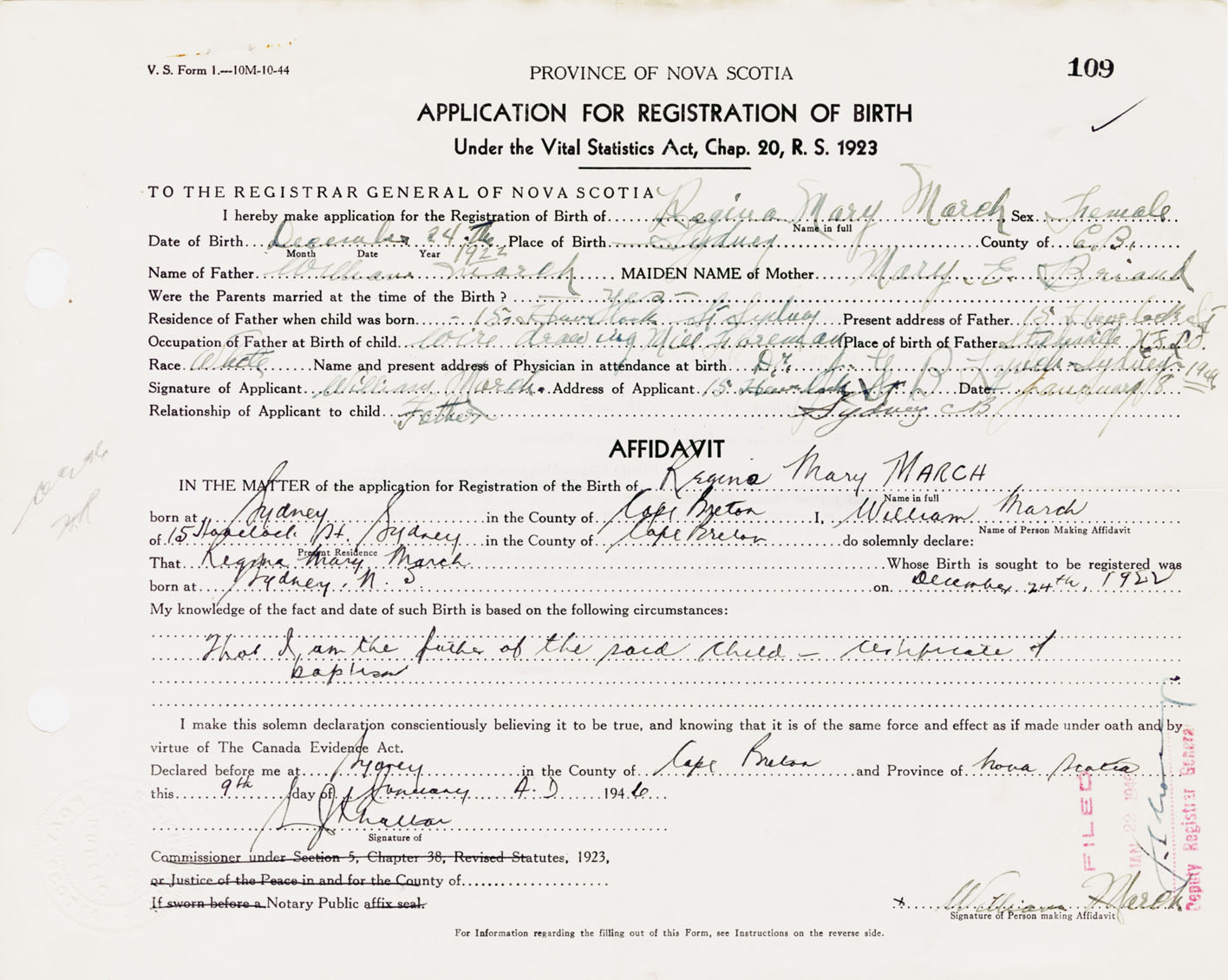 IN THE MATTER of the application for the Registration of the Birth of Regina MaryMarch