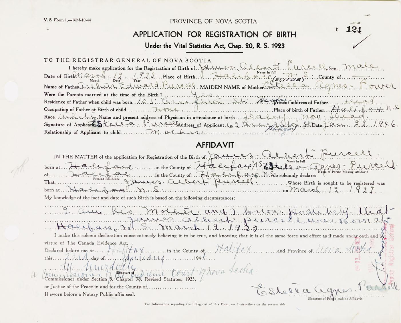 I am his mother and I know positively that James Albert Purcell was born at Halifax, NS on March 12, 1922