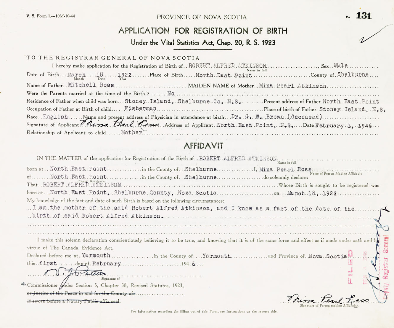 Signature of Applicant Mina Pearl Ross Address of Applicant North East Point, Shelburne Co., NS Date 1 February 1946