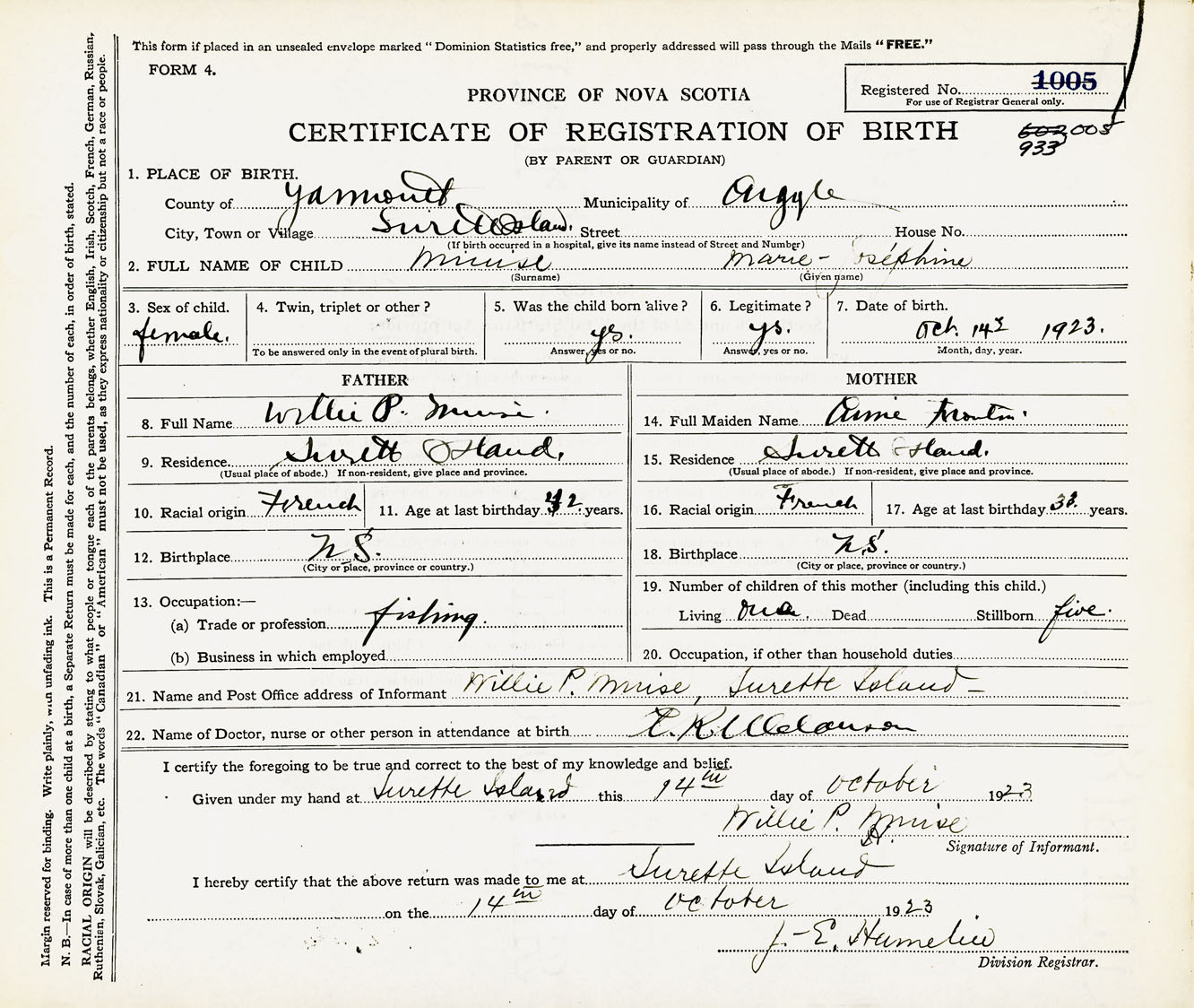 21. Name and Post Office address of Informant Willie P. Muise Surrettes Island, Yarmouth Co., NS