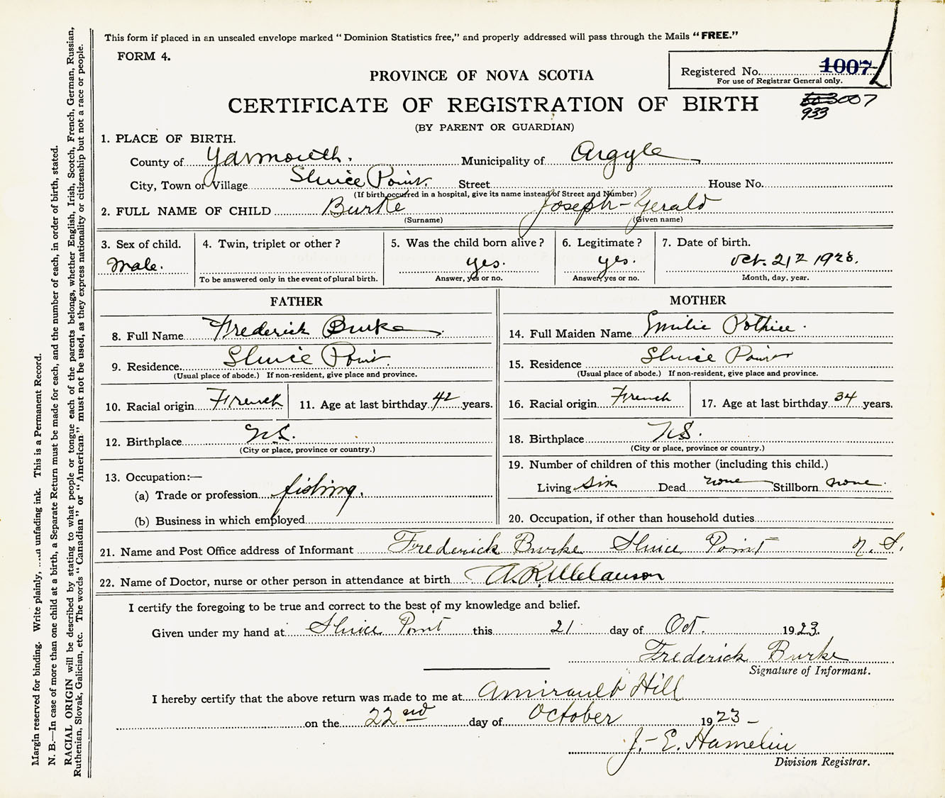 21. Name and Post Office address of Informant Frederick Burke Sluice Point, Yarmouth Co., NS