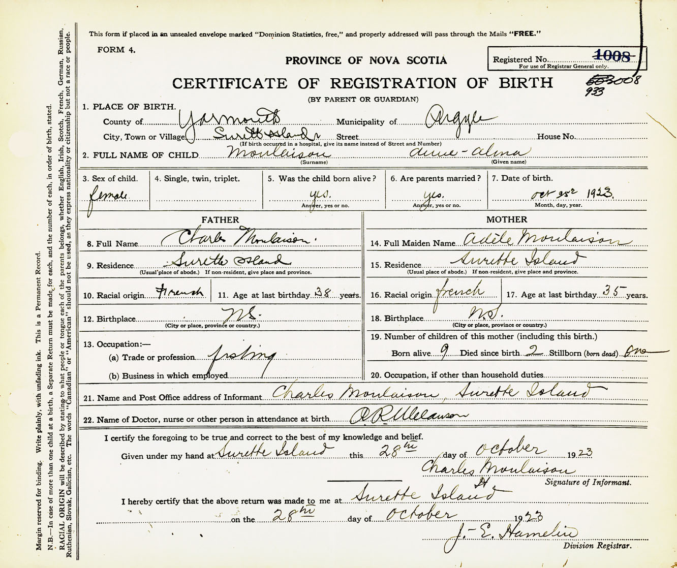 21. Name and Post Office address of Informant Charles Moulaison Surrettes Island, Yarmouth Co., NS