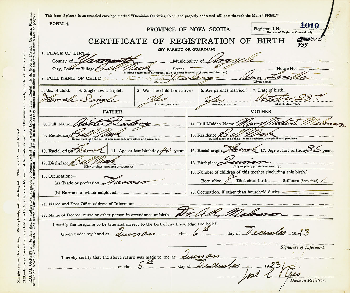 22. Name of Doctor, nurse or other person in attendance at birth Dr. A. R. Melanson
