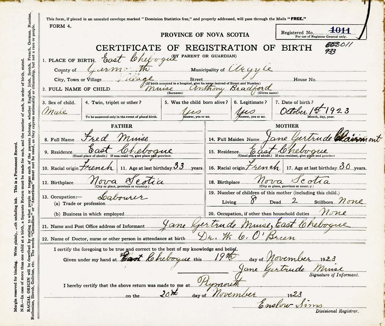 21. Name and Post Office address of Informant Jane Gertrude Muise East Chebogue, Yarmouth Co., NS