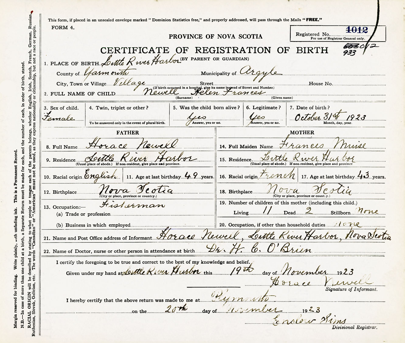 21. Name and Post Office address of Informant Horace Newell Little River Harbour, Yarmouth Co., NS