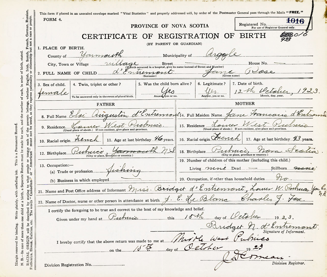 21. Name and Post Office address of Informant Miss. Bridget d'Entremont Lower West Pubnico, Yarmouth Co., NS