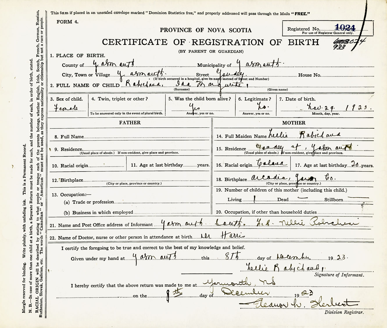 21. Name and Post Office address of Informant Nellie Robichaud Yarmouth South, NS