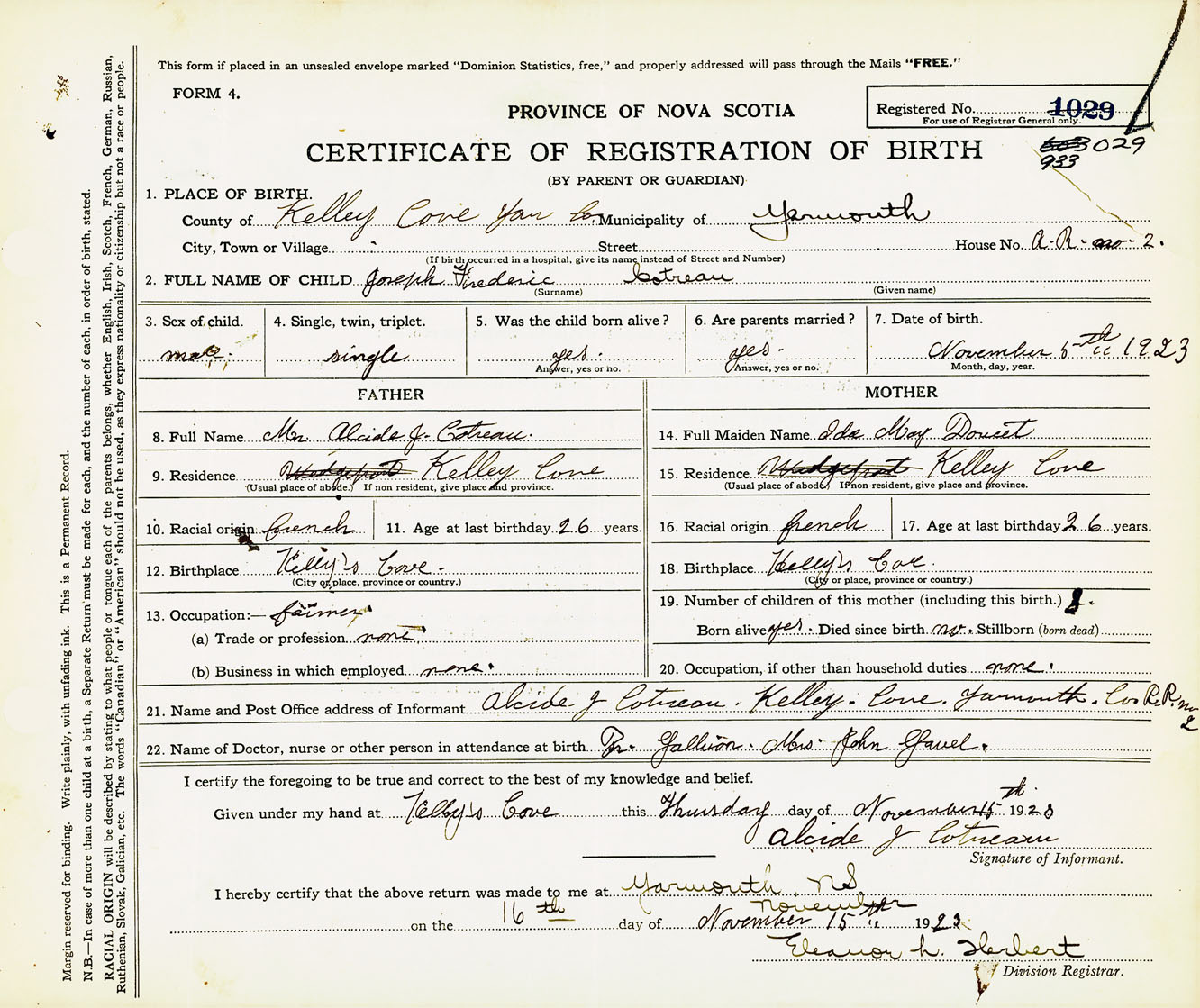 21. Name and Post Office address of Informant Alcide J. Cotreau Kelleys Cove, Yarmouth Co., NS