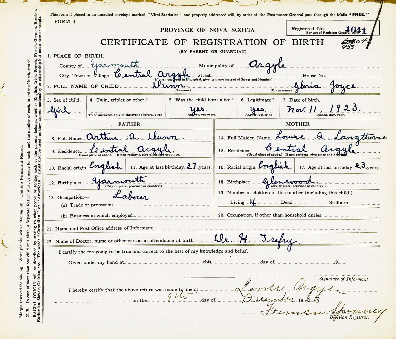 Female Birth Registration: Year: 1923 number: 93300041