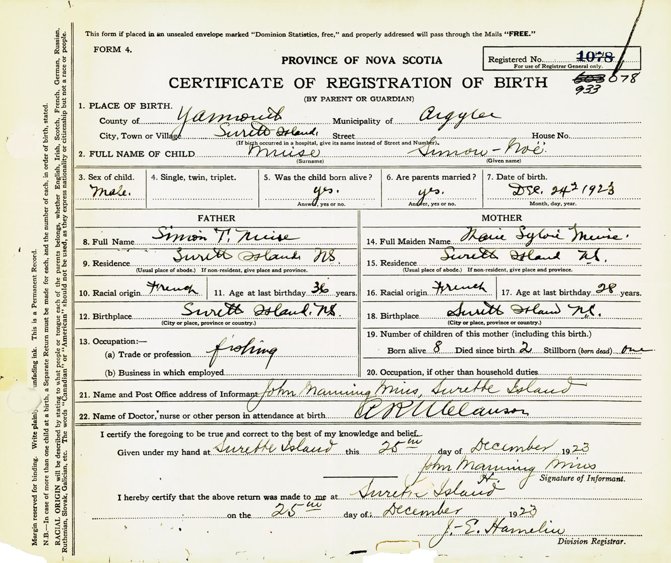Male Birth Registration: Year: 1923 number: 93300078