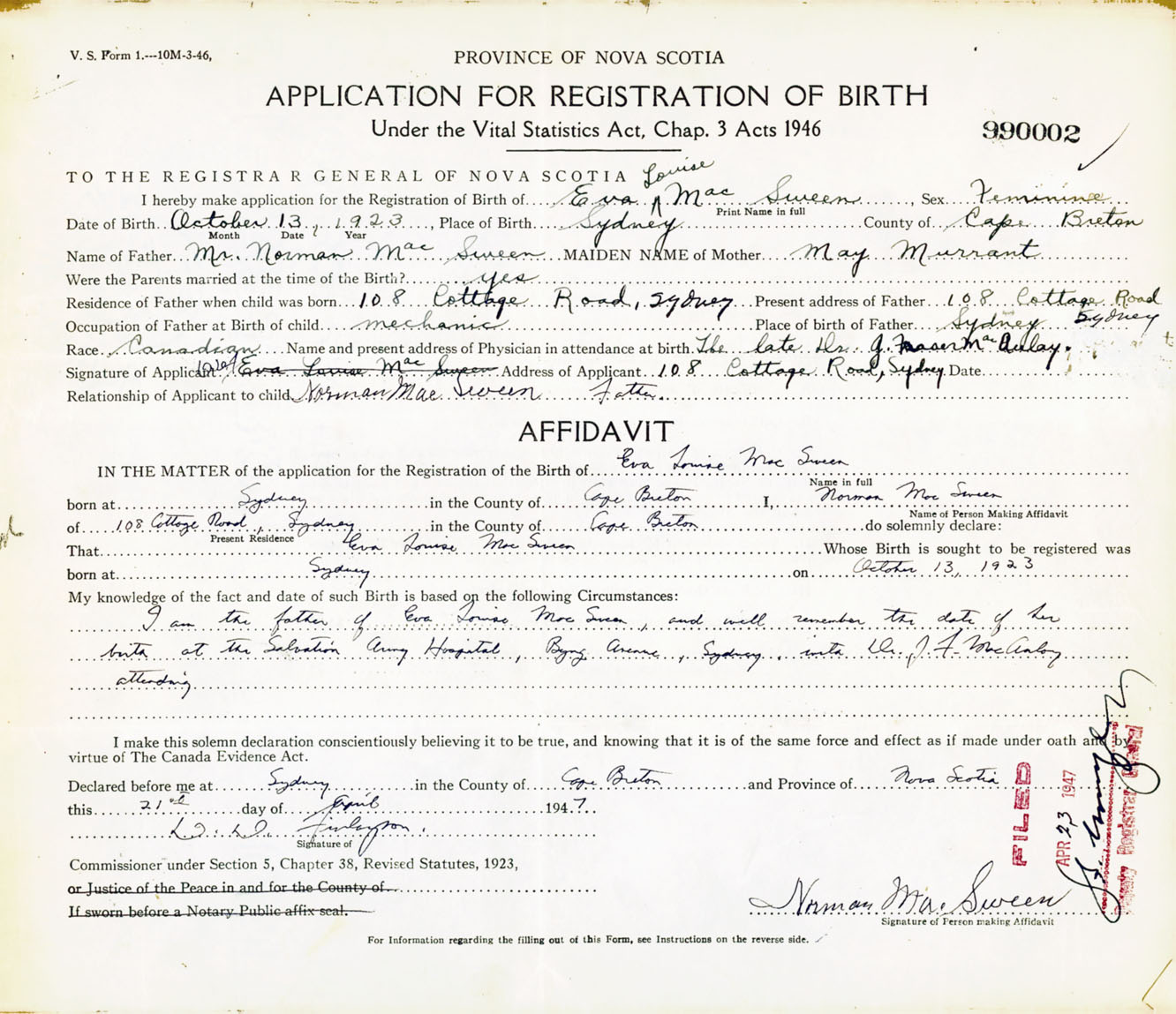 I am the father of Eva Louise MacSween and well remember the date of her birth at the Salvation Army Hospital, Byng Avenue, Sydney, NS with Dr. J. F. McAulay attending.