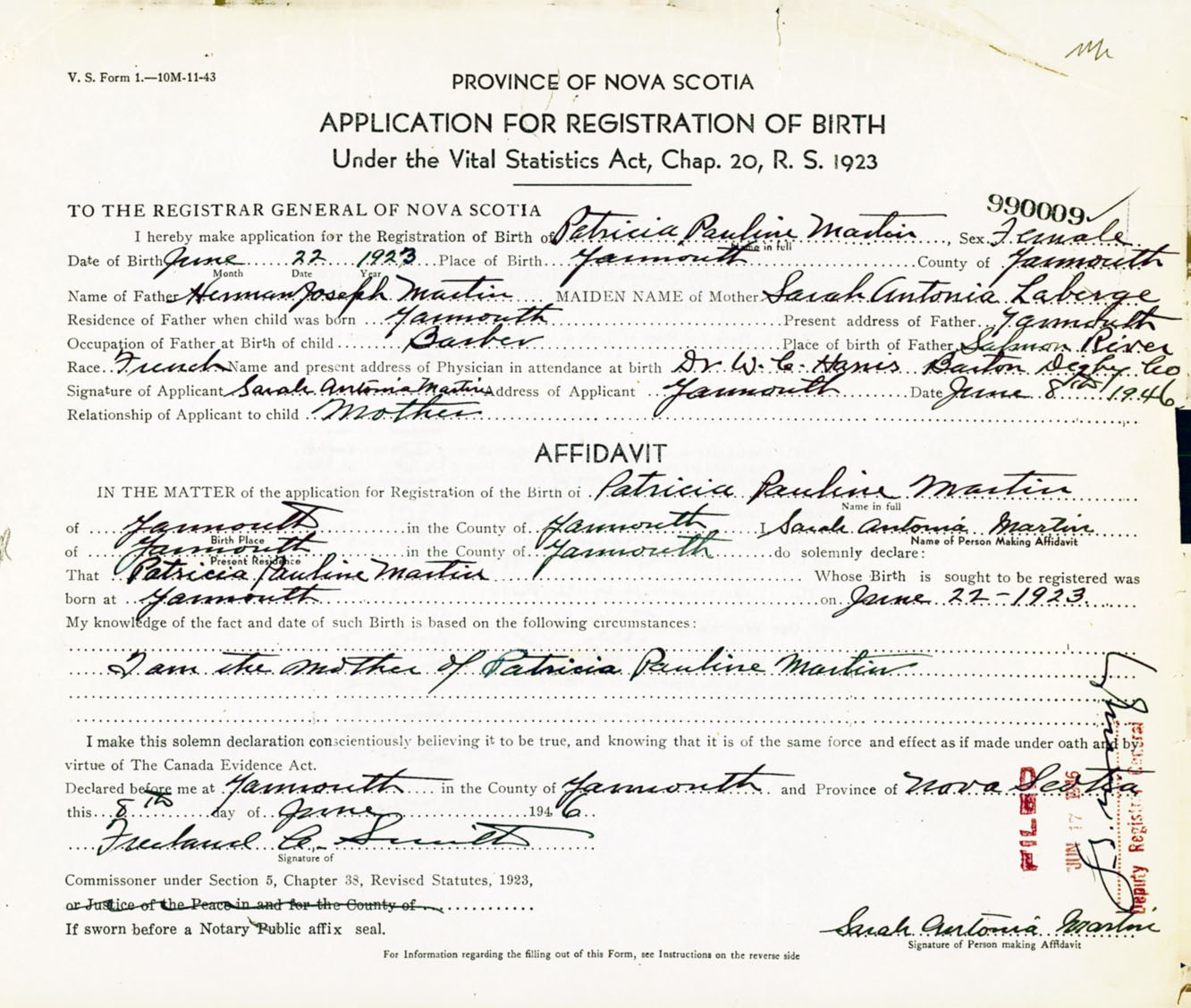Signature of Applicant Sarah Antonia Martin Address of Applicant Yarmouth, NS Date 8 June 1946