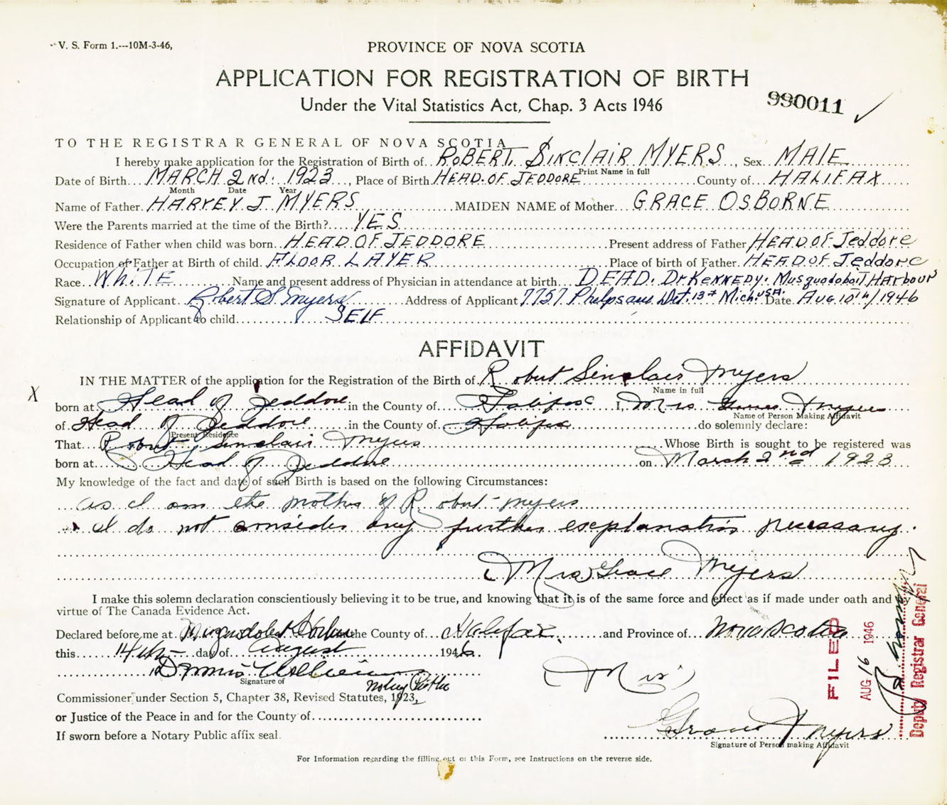 Date of Birth March 2, 1923 Place of Birth Head of JeddoreCounty of Halifax