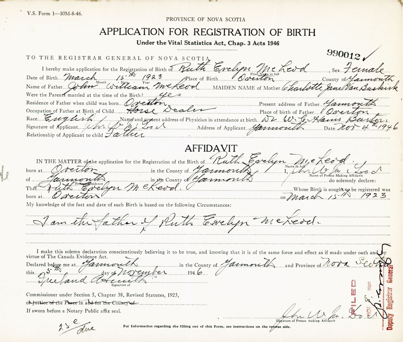 Signature of Applicant John W. McLeod Address of Applicant Yarmouth, NS Date 4 November 1946