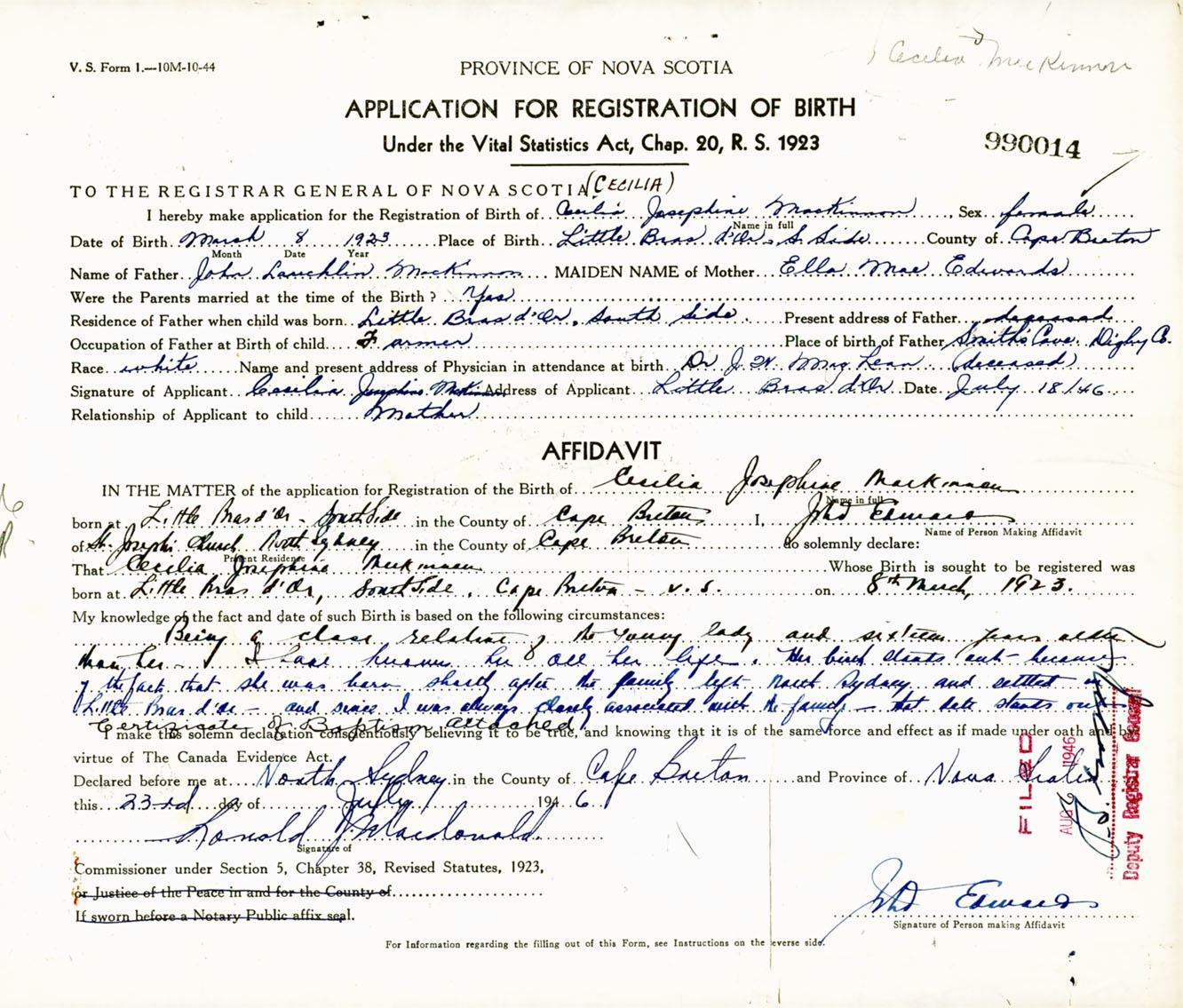 Signature of Applicant Cecilia Josephine MacKinnon Address of Applicant Little Bras d'Or, South Side, Cape Breton Co., NS Date 18 July 1946