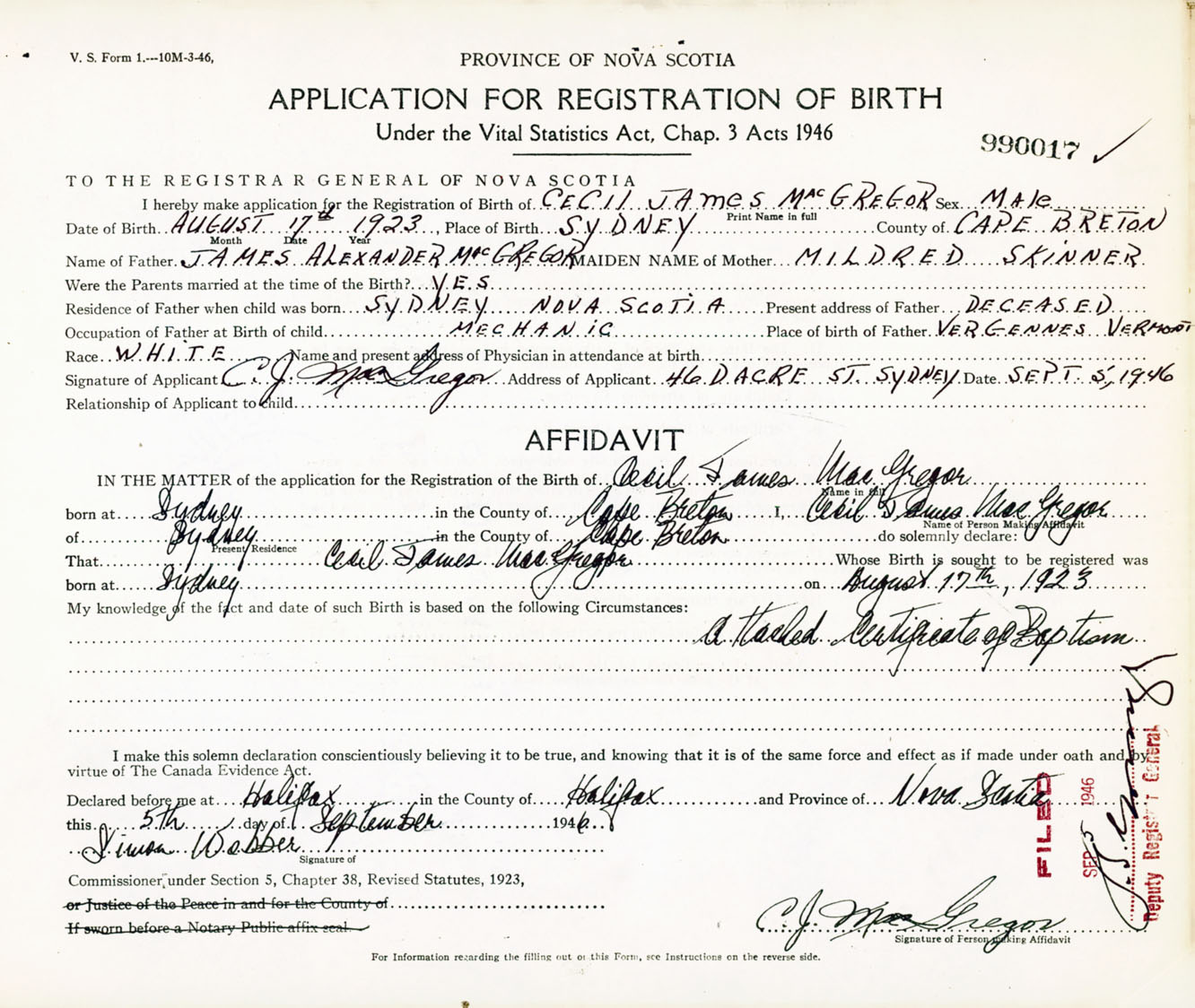 Signature of Applicant C. J. MacGregor Address of Applicant 46 Dacre Street, Sydney, Cape Breton Co., NS Date 5 September 1946