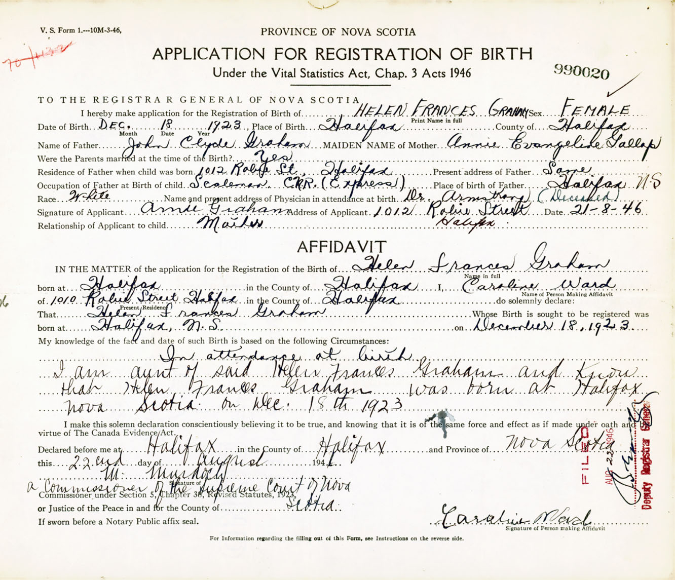 Signature of Applicant Annie Graham Address of Applicant 1012 Robie Street, Halifax, NS Date 21 August 1946