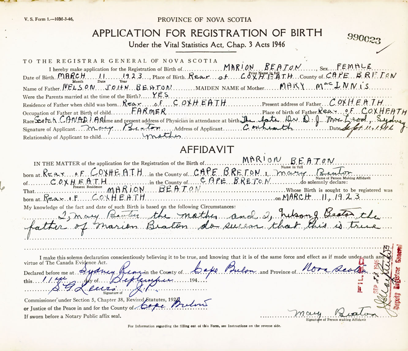 Signature of Applicant Mary Beaton Address of Applicant Coxheath, Cape Breton Co., NS Date 11 September 1946