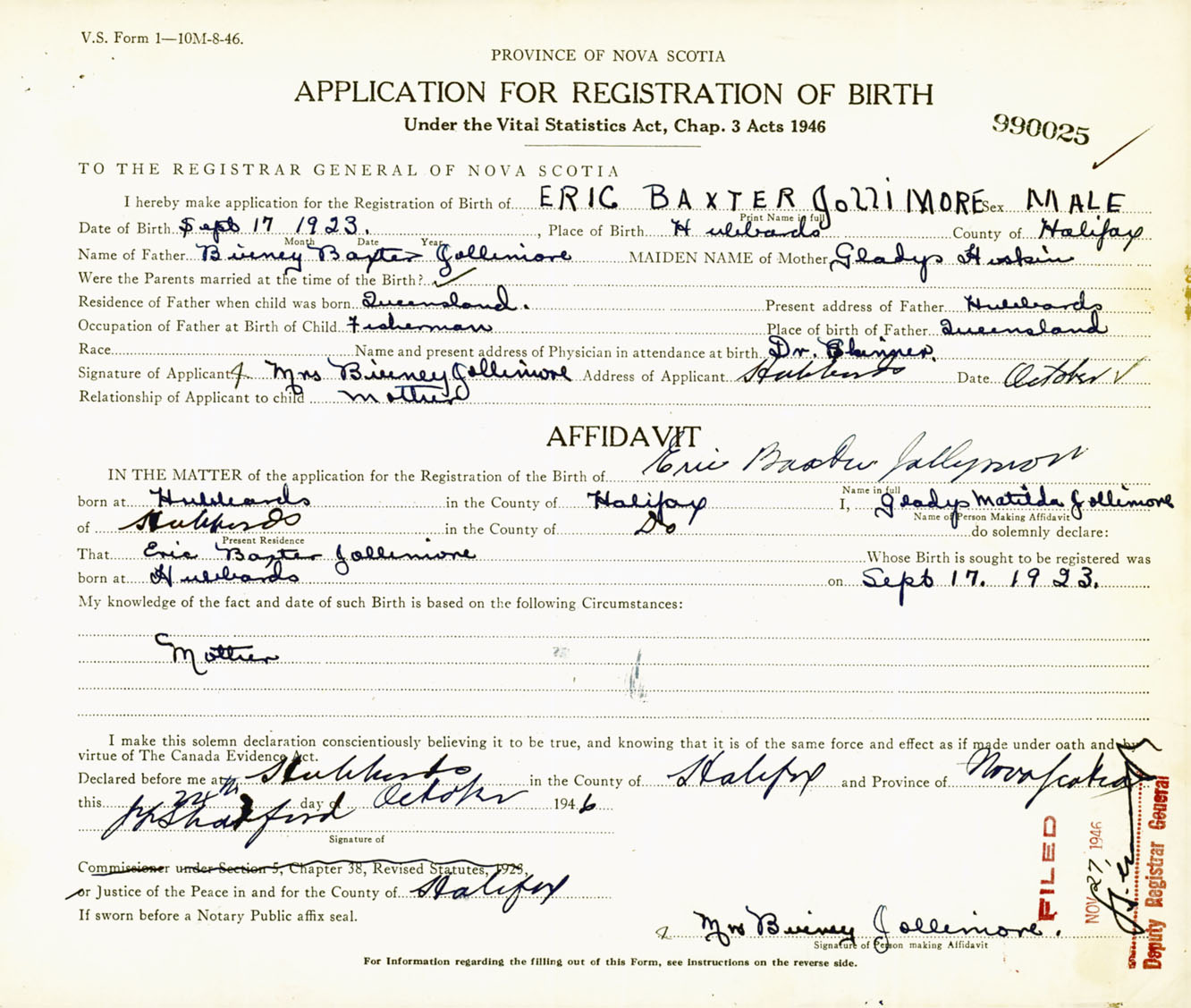 Signature of Applicant Mrs. Birney Jollimore Address of Applicant Hubbards, Halifax Co., NS Date October 1946
