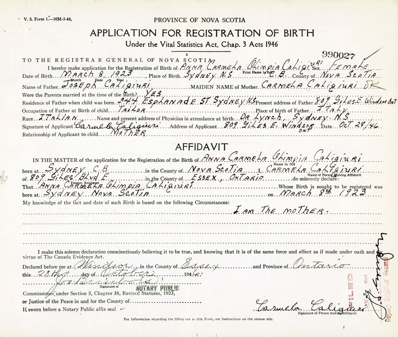 Signature of Applicant Carmela Caligiuri Address of Applicant 809 Giles Street East, Windsor, Ontario Date 28 October 1946