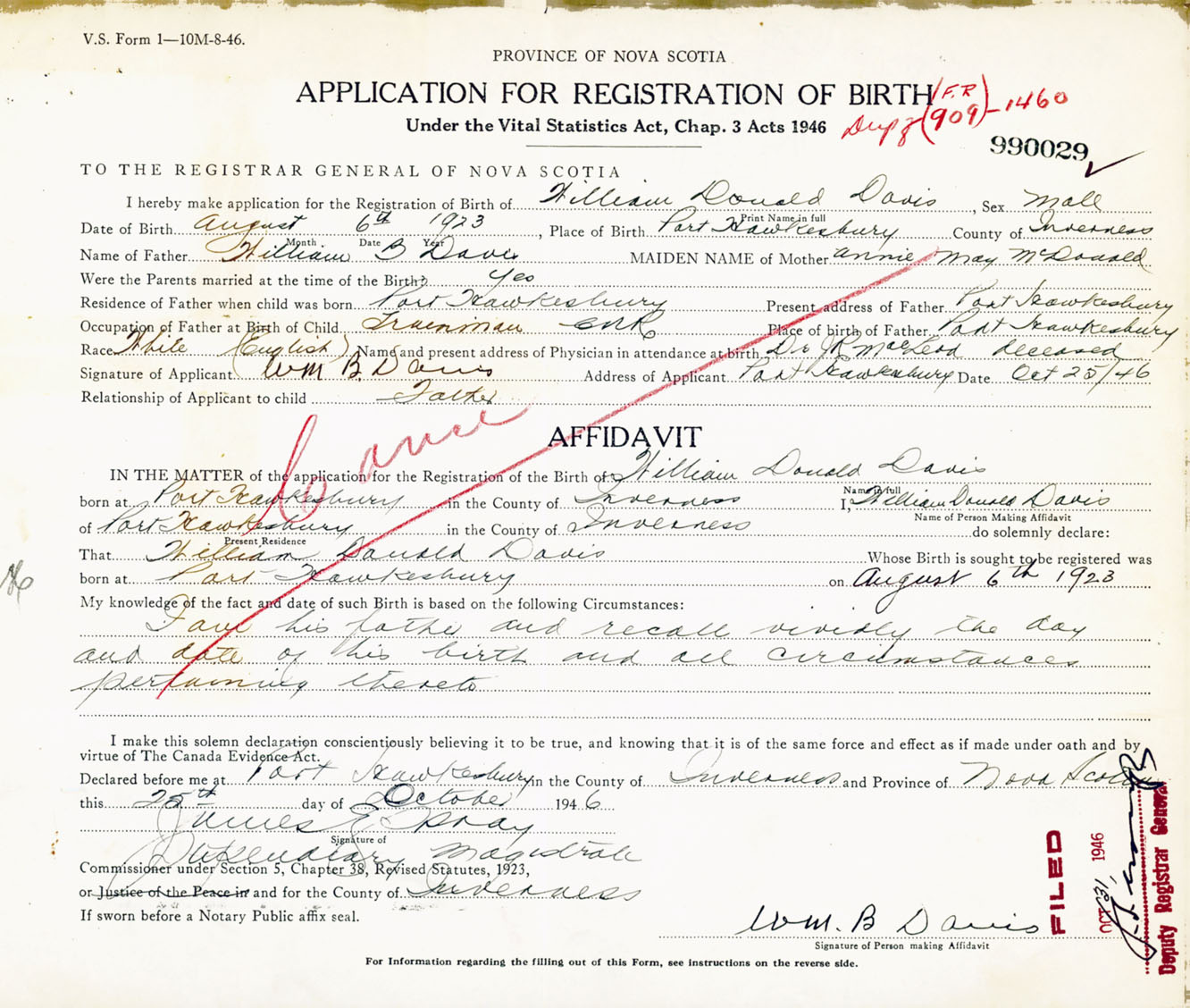 Signature of Applicant William B. Davis Address of Applicant Port Hawkesbury, Inverness Co., NS Date 25 October 1946