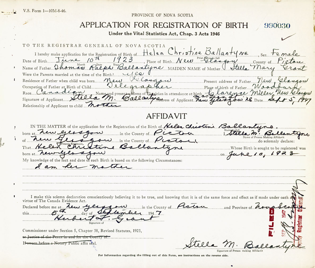 Signature of Applicant Stella M. Ballantyne Address of Applicant MacLean Street, New Glasgow, Pictou Co., NS Date 5 September 1947