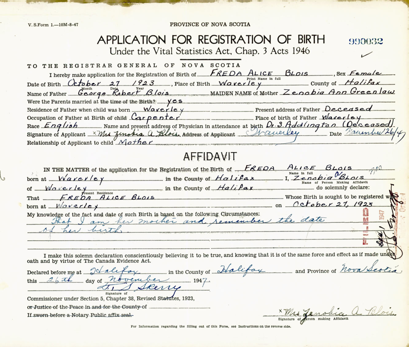 Signature of Applicant Mrs. Zenobia A. Blois Address of Applicant Waverley, Halifax Co., NS Date 26 November 1947
