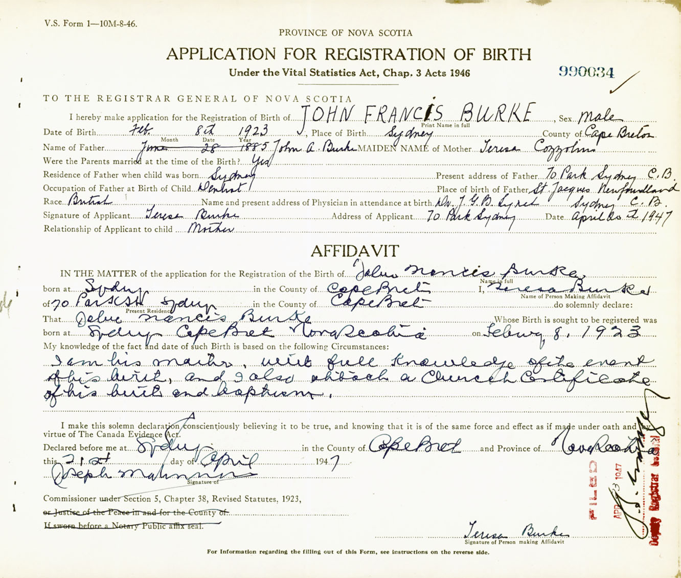 Signature of Applicant Terese Burke Address of Applicant 70 Park Street, Sydney, Cape Breton Co., NS Date 20 April 1947